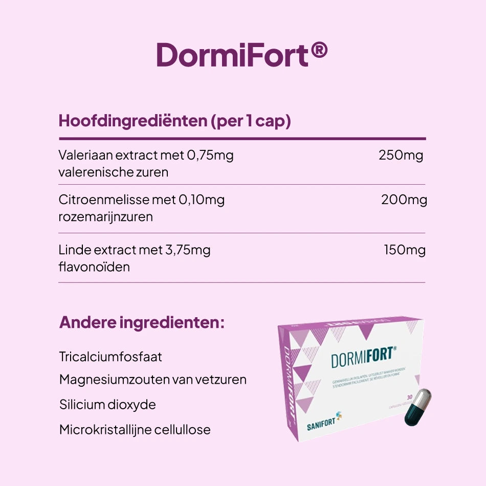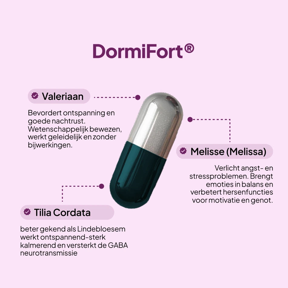 Ik "was" een super slechte en lichte slaper. Inslapen was geen probleem maar reeds wakker na 1,5u, dan verder na een uur tot 1,5u slapen opnieuw wakker.. Daarbij nog elke nacht een 2 tot-3-tal uren klaarwakker. Inslapen lukte nooit. Meerdere tabletten geprobeerd: valeriaan, sediplus, metarelax, melatonine... enz. : niets hielp tot ik Dormifort voorgeschreven kreeg. 1,5 maand aan één stuk ingenomen: het werkt! Ik heb ook geen angst meer om in te slapen, want ik heb opnieuw 'leren' slapen :)